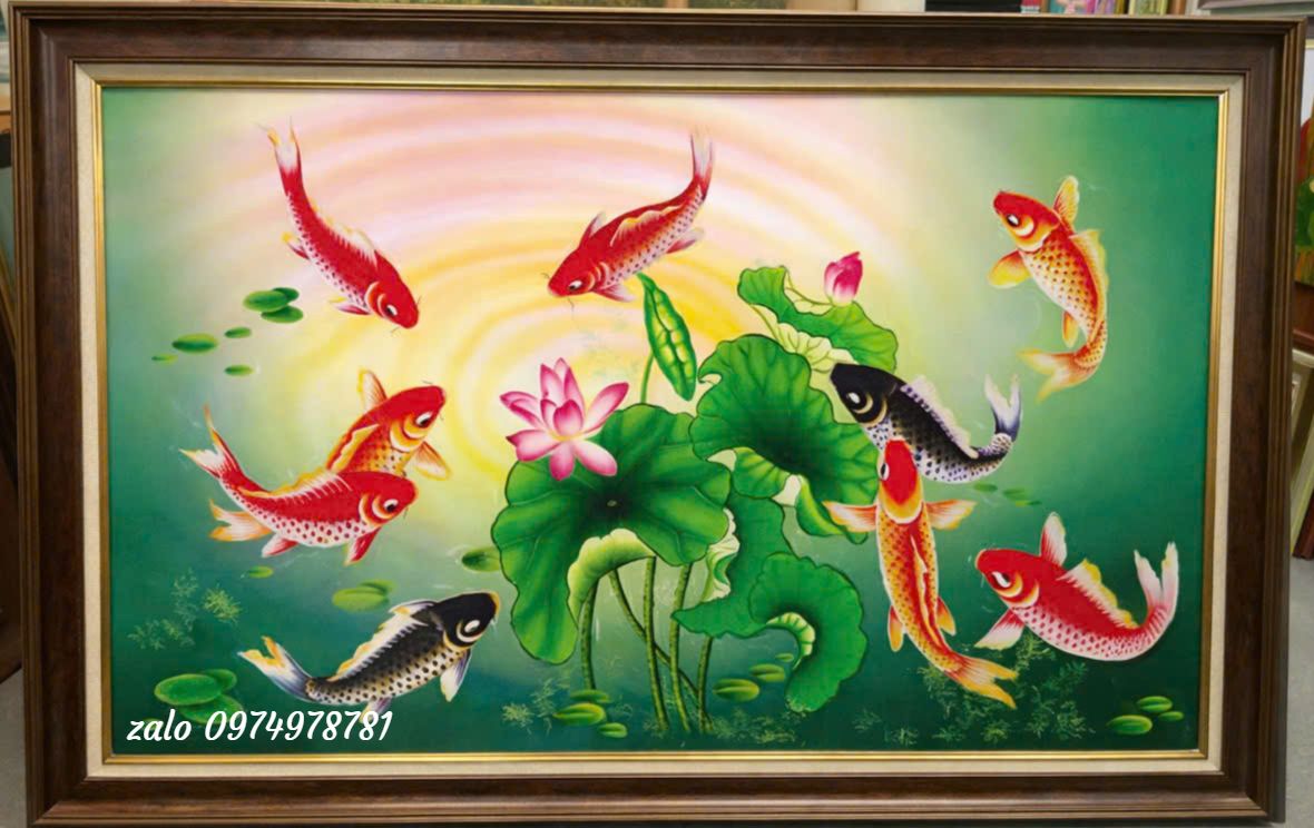 Tranh cá chép hoa sen vẽ tay phong thuỷ Tranh cá chép hoa sen vẽ tay phong thuỷ là dòng tranh sơn dầu nghệ thuật mang ý nghĩa may mắn, tài lộc và thăng tiến trong cuộc sống. Hình ảnh cá chép tượng trưng cho sự kiên trì, thành công và công danh sự nghiệp, kết hợp cùng hoa sen – biểu tượng của sự thanh cao, thuần khiết và bình an, tạo nên bức tranh phong thuỷ hài hoà, giàu giá trị tinh thần. Tranh được vẽ tay hoàn toàn bằng chất liệu sơn dầu cao cấp, màu sắc bền đẹp, đường nét mềm mại, có chiều sâu nghệ thuật. Tranh cá chép hoa sen phong thuỷ rất thích hợp treo phòng khách, phòng làm việc, phòng thờ hoặc làm quà tặng tân gia, khai trương, mang ý nghĩa chiêu tài hút lộc, gia đạo an yên và cuộc sống sung túc.