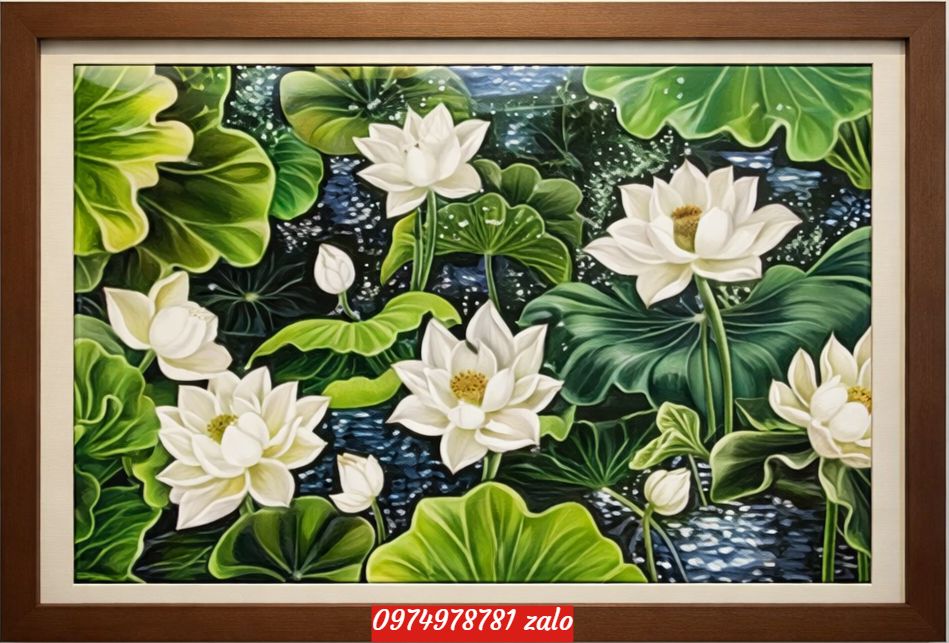Gam màu xanh trong tranh thường gợi cảm giác mát mẻ, dịu mắt, giúp không gian trở nên thư thái và dễ chịu hơn. Khi kết hợp với hình ảnh hoa sen – loài hoa biểu tượng của sự thuần khiết và cao quý – bức tranh tạo nên một tổng thể hài hòa, tinh tế và đầy sức sống. Những bức tranh sơn dầu hoa sen tông xanh thường được vẽ với hồ sen xanh mát, lá sen mềm mại và những bông sen nở rực rỡ, mang lại cảm giác gần gũi với thiên nhiên.