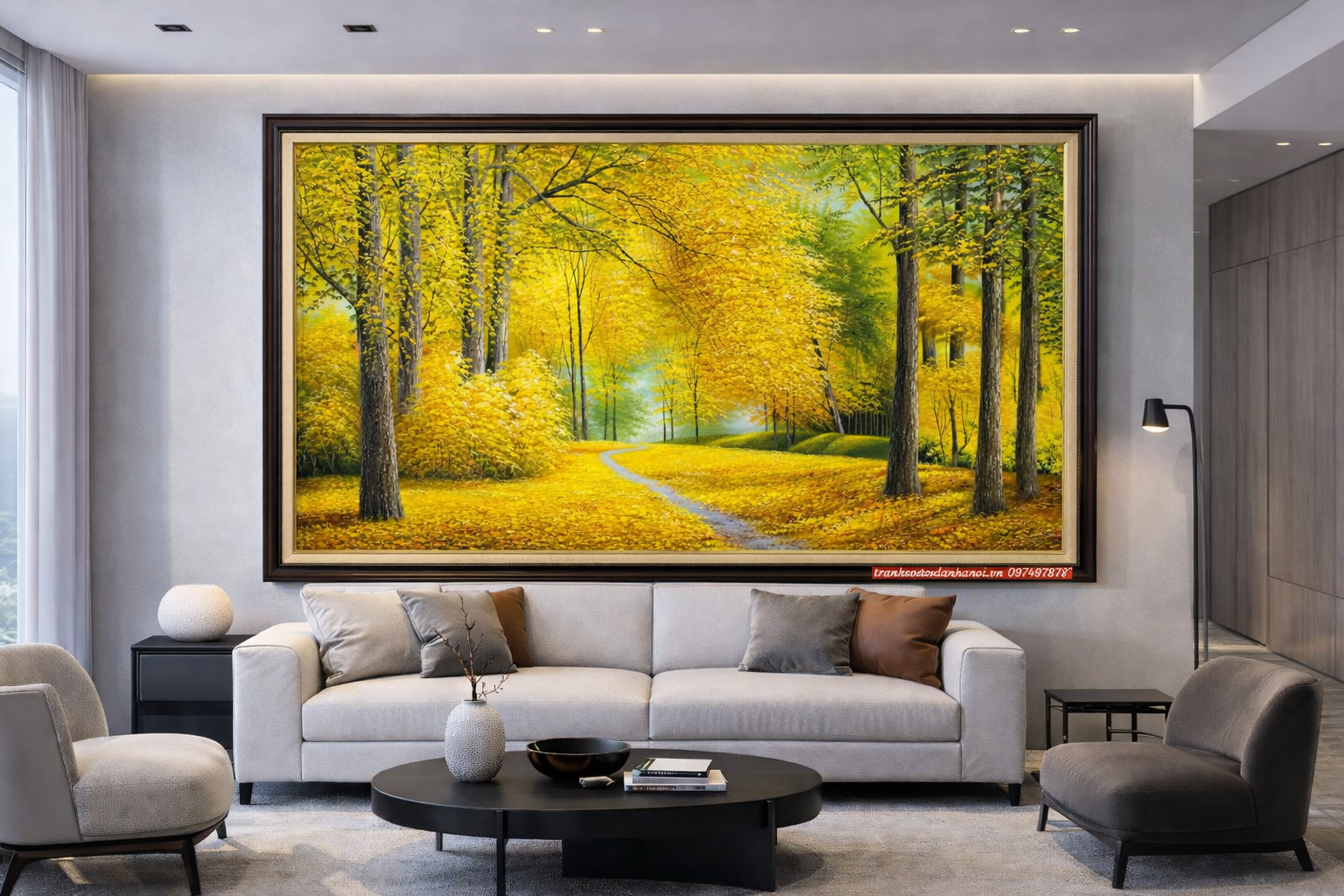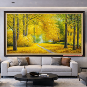 Tranh mùa thu vàng tranh sơn dầu phong cảnh là lựa chọn trang trí được nhiều người yêu nghệ thuật và không gian sống tinh tế ưa chuộng. Với gam màu vàng ấm áp đặc trưng của mùa thu, bức tranh tái hiện khung cảnh thiên nhiên lãng mạn qua những hàng cây thay lá, con đường nhỏ yên bình hay mặt hồ tĩnh lặng, mang lại cảm giác thư giãn và sâu lắng. Tranh sơn dầu phong cảnh mùa thu vàng không chỉ có giá trị thẩm mỹ cao mà còn bền màu theo thời gian, phù hợp treo phòng khách, phòng ngủ, phòng làm việc hoặc làm quà tặng sang trọng. Nhờ sự kết hợp hài hòa giữa màu sắc, ánh sáng và chiều sâu bố cục, tranh mùa thu vàng giúp không gian trở nên ấm cúng, gần gũi với thiên nhiên và thể hiện gu thẩm mỹ tinh tế của gia chủ.