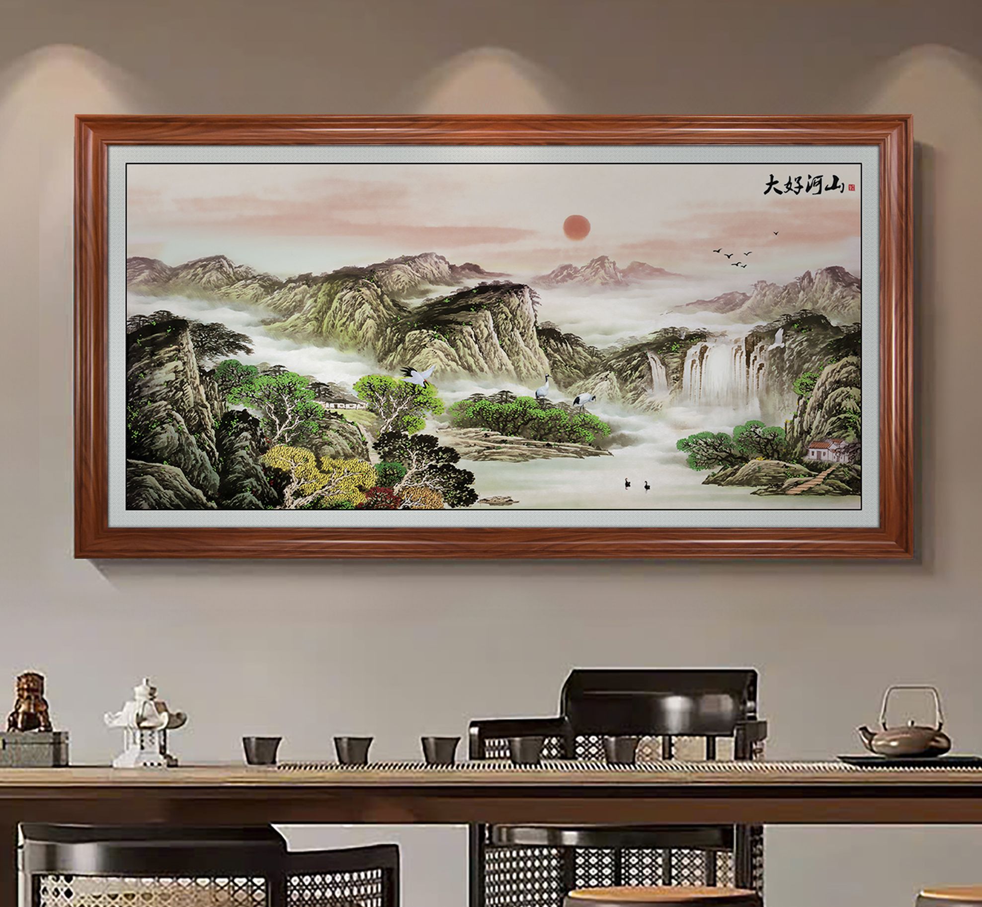Không gian treo tranh thủy mặc sơn thủy rất đa dạng, từ phòng khách, phòng làm việc, phòng trà đến sảnh công ty, nhà hàng hay khách sạn theo phong cách Á Đông. Bức tranh không chỉ làm tăng giá trị thẩm mỹ cho không gian mà còn thể hiện gu nghệ thuật tinh tế, chiều sâu nội tâm và phong thái điềm tĩnh của người sở hữu.